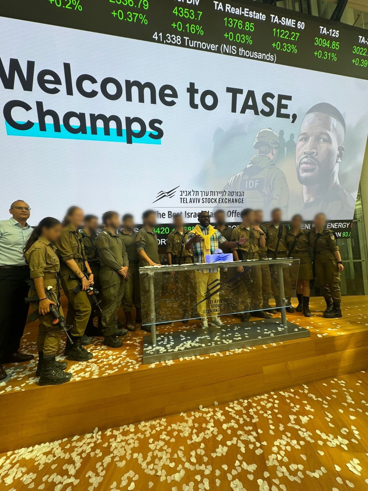 הבוקר (שני) נערך בבורסה לניירות ערך בתל אביב טקס פתיחת מסחר חגיגי ומרגש, בהשתתפות המתאגרף האגדי ואלוף העולם לשעבר, פלויד מייוות'ר, לצד לוחמים ולוחמות שלחמו בזירות הקרב מאז אירועי ה-7 באוקטובר.