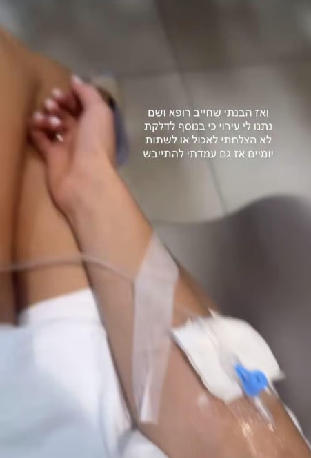 בסטורי שהעלתה לחשבון האינסטגרם שלה, צירפה המדליסטית האולימפית תמונה של העירוי שעברה בבית החולים, וכתבה ברקע: "ואז הבנתי שחייב רופא, ושם נתנו לי עירוי, כי בנוסף לדלקת לא הצלחתי לאכול או לשתות יומיים. אז גם עמדתי להתעלף". בהמשך, מצבה הבריאותי השתפר והיא שוחררה לביתה להמשיך ולחגוג יחד עם בעלה הטרי, נמרוד קריבצקי, את נישואיהם.