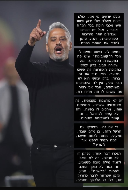 עוד הוסיף: "די עם זה. תפסיקו עם הרעל הזה. בן אדם עובד, משקיע, מנסה לבנות משהו, למה תמיד לחפש איך להוריד. תזכירו דבר אחד: לפרגן זו לא מחלה. זה לא כואב להגיד מילה טובה כשמגיע, וזה בטח לא הופך אתכם לפחות 'פרשנים'. הגיע הזמן שנחזור לדבר כדורגל נטו, בלי הלכלוך שמסביב".