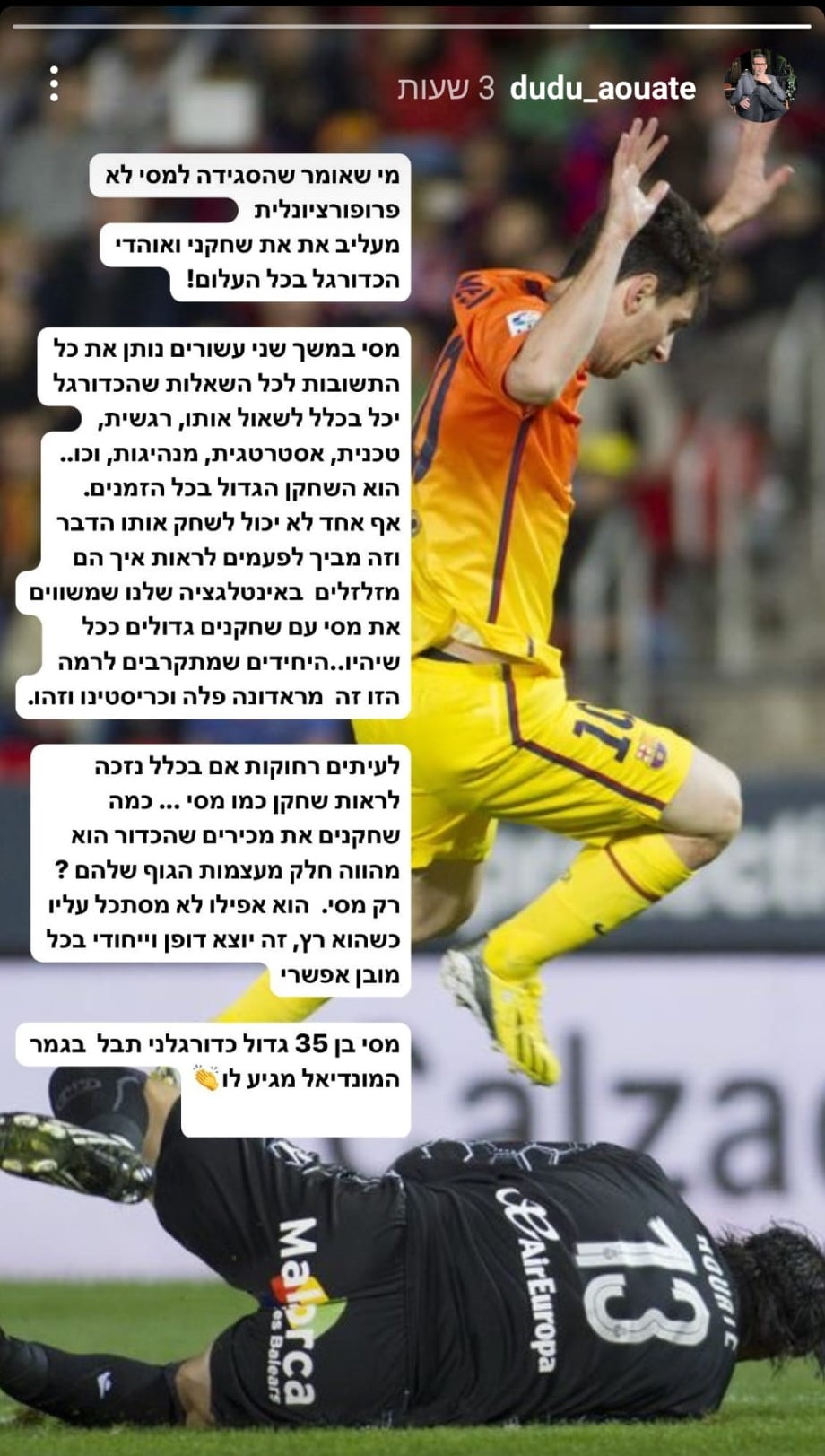 שוער נבחרת ישראל יצא נגד המצקצקים על מסי וכתב: "מי שאומר שהסגידה למסי לא פרופורציונלית, מעליב את שחקני ואוהדי הכדורגל בכל העולם. מסי במשך שני עשורים נותן את כל התשובות לכל השאלות שהכדורגל יכל בכלל לשאול אותו, רגשית טכנית, אסטרטגית, מנהיגות וכו'. הוא השחקן הגדול בכל הזמנים."