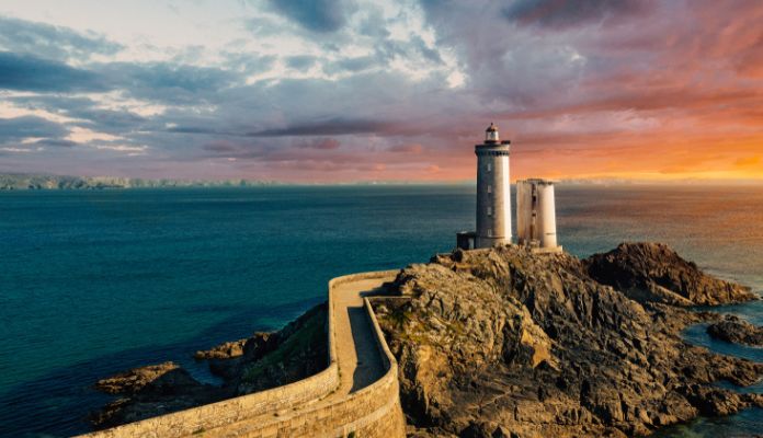 הדרמטי והפראי: בחבל ברטאן שבצרפת, הידוע בחופיו הפראיים, ניצב המגדלור המרהיב הזה. מה שמייחד אותו הוא מיקומו על סלע בים, המחובר ליבשה באמצעות גשר אבן מקושת. בזמן גאות וסערה, הגלים מתנפצים על הגשר והמגדלור נראה כמבצר בודד הנלחם באיתני הטבע. האור האדום שלו מזהיר ספינות מפני שרטון מסוכן, והאגדה המקומית מספרת ש"מינו מראה אדום כשהוא מכסה את העלמות" (הסלעים המסוכנים).