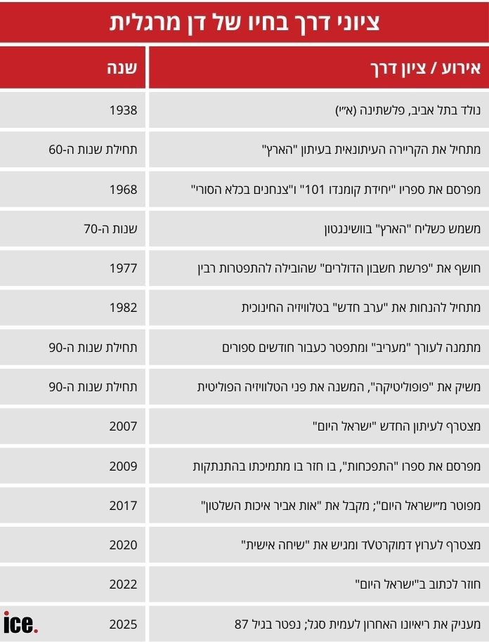 עם פטירתו של דן מרגלית ז"ל בגיל 87 (1938-2025) נחתם פרק סוער ומשמעותי בתולדות המדינה. במשך יותר משישה עשורים, מרגלית היה נוכחות מתמדת בצמתים המכריעים של ההיסטוריה הישראלית, לעיתים כמתעד ולעיתים קרובות כזרז לאירועים עצמם. מורשתו היא דיוקן של ניגודים חריפים: מצד אחד, העיתונאי האמיץ שהסקופ שלו הפיל ממשלה והגדיר מחדש את גבולות הכוח של התקשורת. מצד שני, איש ששנותיו האחרונות הוכתמו בצל כבד של האשמות קשות, שהותירו את מורשתו מורכבת ובלתי פתורה.