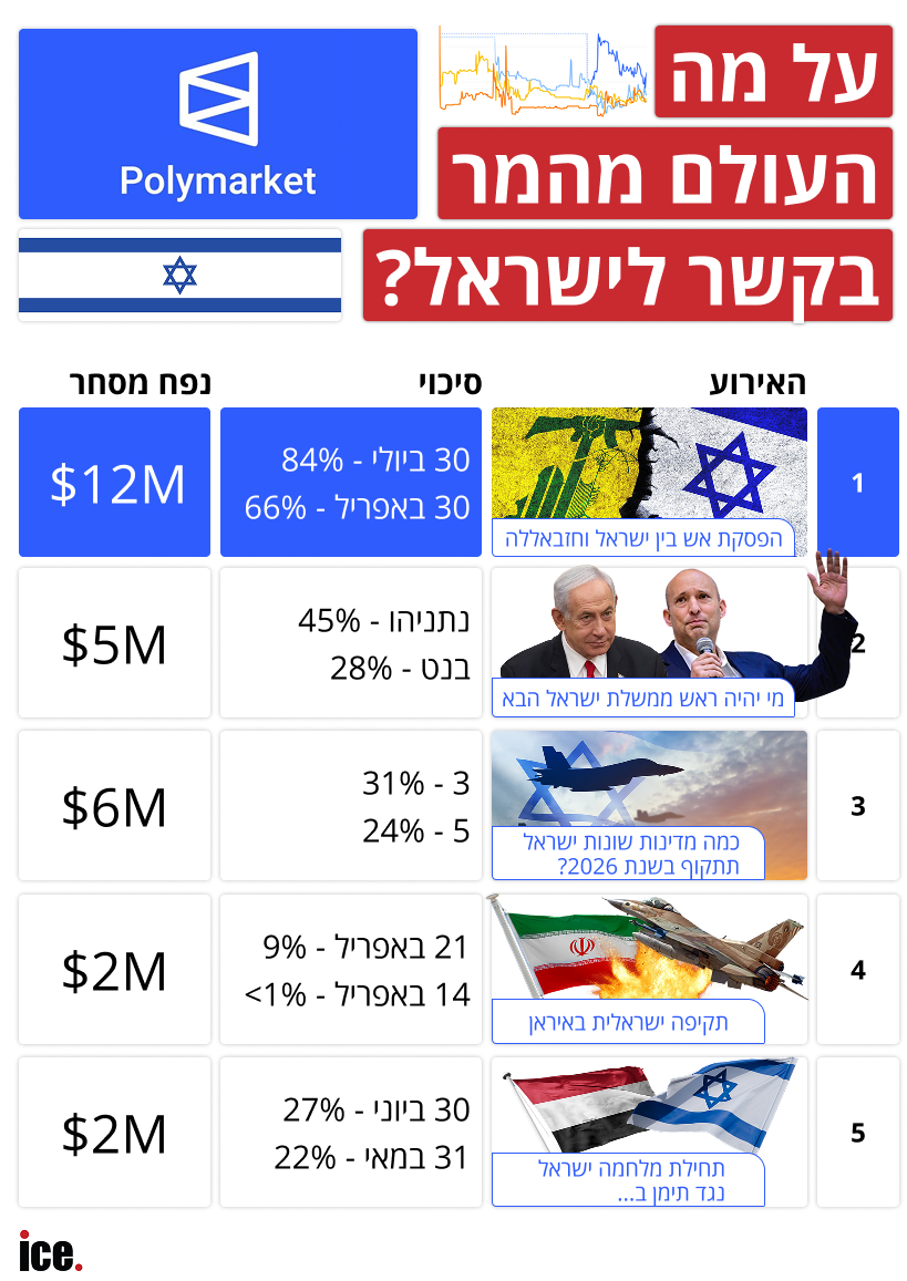 הנתונים שלפנינו מציגים תמונת מצב מרתקת של השוק בתקופה האחרונה; חשוב לציין שחלק מההימורים הללו מתייחסים לחודשים האחרונים - חלקם צופים פני עתיד וחלקם כבר התבהרו בזמן אמת, מה שמאפשר לנו לראות עד כמה המהמרים היו קרובים למציאות. הנה הדירוג של מה שבאמת מעניין את העולם בישראל: