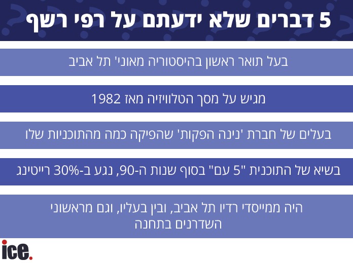 עשורים שלמים שהוא נמצא בטלוויזיה וברדיו, גם בקדמת הבמה וגם חזק מאחורי הקלעים. לאחר כמה זיגזגים בין ערוץ 2 לערוץ 10, רפי רשף מצא את מקומו בערוץ 12 בשעה חמש, שעה שכבר רשומה על שמו | חמישה דברים שלא ידעתם