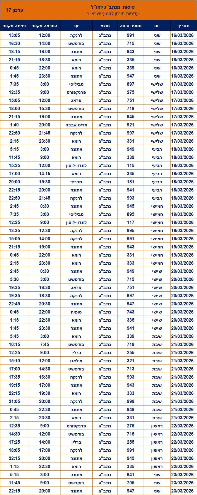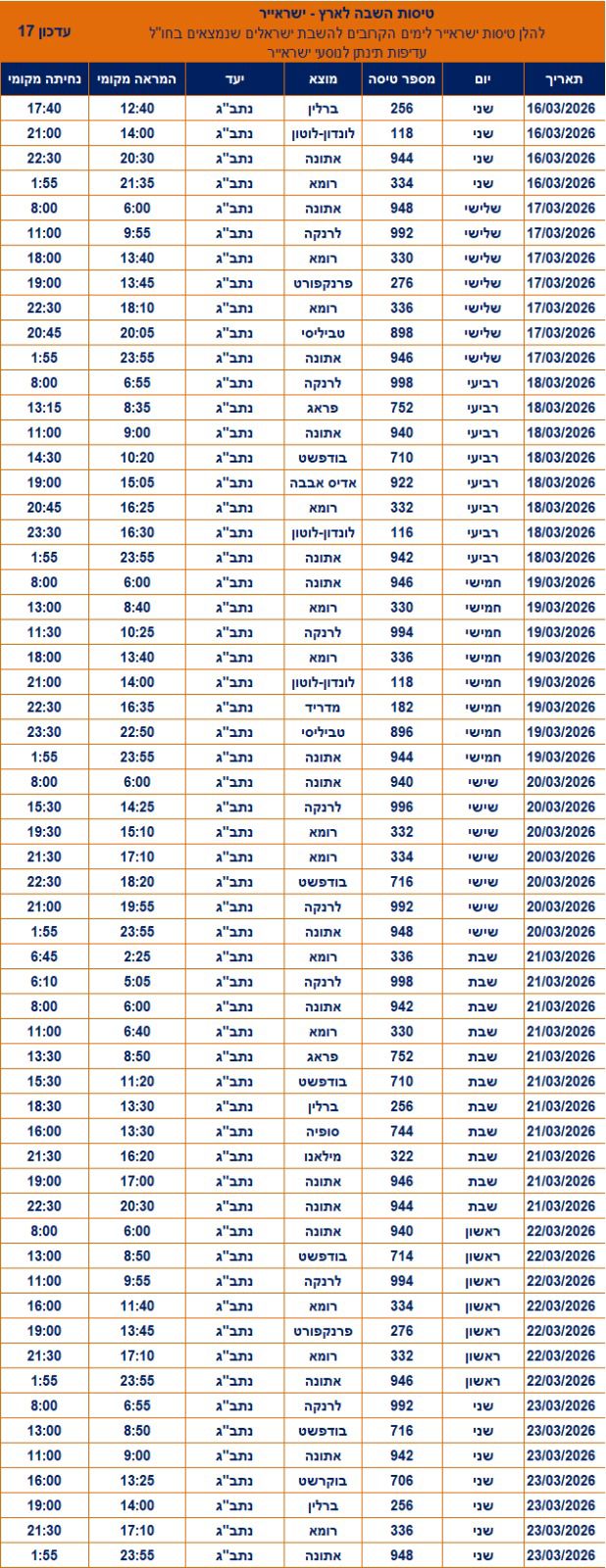 חברת התעופה הישראלית, ישראייר, מפרסמת כעת את לוח טיסות החילוץ שלה לישראל וממנה עד לתאריך 23 במרץ 2026. בין היעדים שיופעלו אליהם טיסות בימים הקרובים נמנים: מילאנו, פרנקפורט, בודפשט, פראג, רומא, טביליסי, אתונה, לרנקה, סופיה, לונדון, ברלין, בוקרשט, אדיס אבבה ומדריד.
