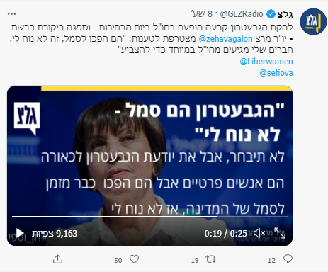 גם יו"ר מרצ, זהבה גלאון, התייחסה לכך בריאיון בגלי צה"ל הבוקר ואמרה כי "לי לא נוח אני חייבת להודות, כי החברים שלי מגיעים מחו"ל במיוחד להצביע כאן, כדי שממשלת ביביסטים-כהניסטים לא תיבחר. הגבעטרון לכאורה הם אנשים פרטיים אבל הם הפכו כבר מזמן לסמל של המדינה, אז לא נוח לי, אני חייבת להודות שזה ממש לא נוח לי".