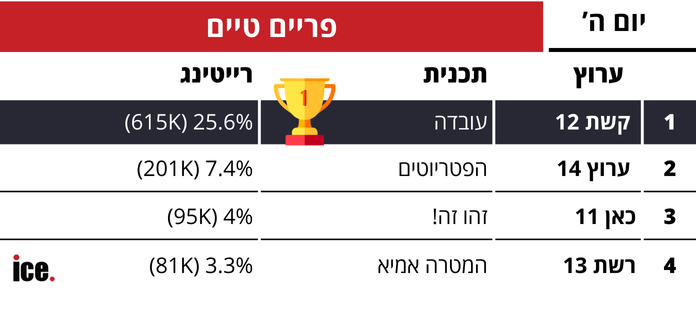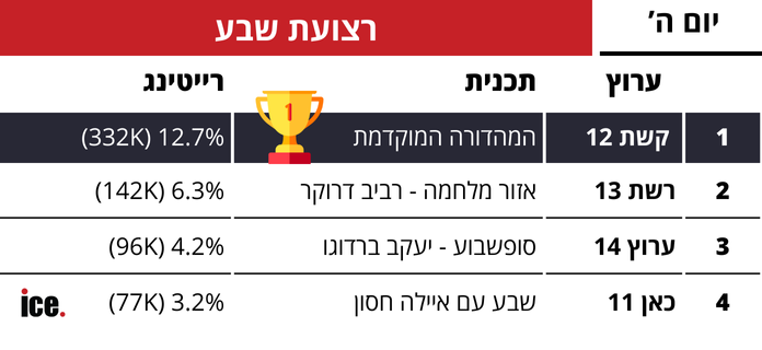 הקרב על הרייטינג בין ארבעת ערוצי הטלוויזיה הגדולים בישראל ממשיך. בינתיים, קשת 12 שלטה ממשיכה לשלוט ביד רמה בכל הרצועות. אמש (חמישי), הריאיון עם שורד השבי אלי שרעבי ששודר בתוכנית 'עובדה' של אילנה דיין בקשת 12, הוא שיתף לראשונה חווית אישית שלו מהשבת השחורה ותקופת השבי בעזה, שבר את השיא של תוכנית "עובדה" בערוץ 12, לאחר שזכה בנתון של 25.6% רייטינג ו-615,000 צופים.