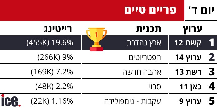 ארץ נהדרת" של קשת 12 שולטת ללא עוררין עם רייטינג מרשים של 19.6% המהווים כ-455 אלף צופים, הפטריוטים לא קרובים לאיים אך עדיין במקום השני