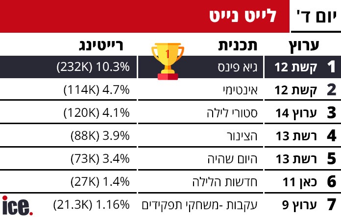 בשעות הלילה המאוחרות, "גיא פינס" בקשת 12 מוביל עם רייטינג של 10.3% (כ-232 אלף צופים). במקום השני "אינטימי" בקשת 12 עם 4.7% (כ-114 אלף צופים). במקום השלישי "סטורי לילה" בערוץ 14 עם 4.1% (כ-120 אלף צופים). במקום הרביעי "הצינור" ברשת 13 עם 3.9% (כ-88 אלף צופים). במקום החמישי "היום שהיה" ברשת 13 עם 3.4% (כ-73 אלף צופים). במקום השישי "חדשות הלילה" בכאן 11 עם 1.4% (כ-27 אלף צופים). במקום השביעי "עקבות - משחקי תפקידים" בערוץ 9 עם 1.16% (כ-21.3 אלף צופים).