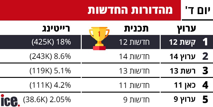 במהדורות החדשות, "חדשות 12" של קשת 12 מובילה עם רייטינג משמעותי של 18% (כ-425 אלף צופים). במקום השני "חדשות 14" בערוץ 14 עם 8.6% (כ-243 אלף צופים). במקום השלישי "חדשות 13" ברשת 13 עם 5.1% (כ-119 אלף צופים). במקום הרביעי "חדשות 11" בכאן 11 עם 4.2% (כ-111 אלף צופים). במקום החמישי "חדשות 9" בערוץ 9 עם 2.05% (כ-38.6 אלף צופים).