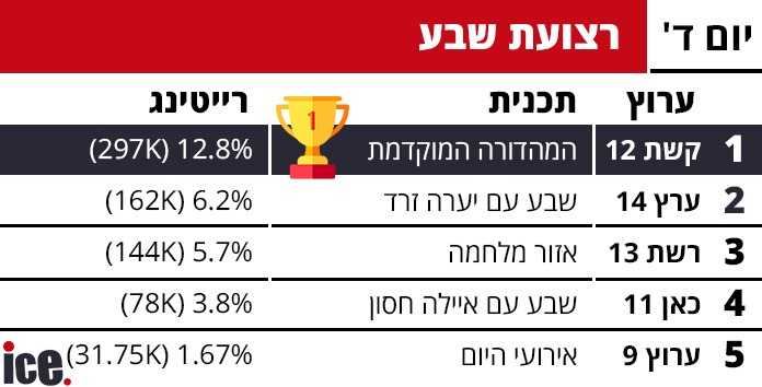 1.רייטינג ערוץ 12 פייק (כולל צפיה פאסיבית במוסדות קניוניתום 03/2025/06הגב לתגובה זו14 5רייטינג 14 ללא ישע וסטימינגסגור