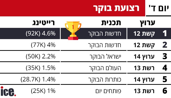 בשעות הבוקר, תכנית חדשות הבוקר של קשת 12 מובילה באופן משמעותי עם נתוני צפייה של 4.6% המהווים כ-92 אלף צופים. במקום השני נמצאת מהדורת חדשות הבוקר של קשת 12 עם רייטינג של 4% (כ-77 אלף צופים). המקום השלישי נתפס על ידי "ישראל הבוקר" בערוץ 14 עם רייטינג של 2.2% (כ-50 אלף צופים). במקום הרביעי "העולם הבוקר" של רשת 13 עם 1.5% (כ-35 אלף צופים). המקום החמישי הולך ל"כותרות הבוקר" בערוץ 14 עם 1.4% (כ-28.7 אלף צופים). סוגרת את הרשימה "פותחים יום" ברשת 13 עם רייטינג של 1% (כ-25 אלף צופים).
