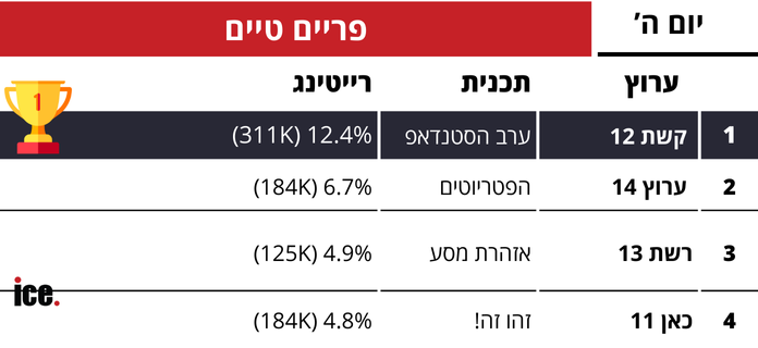 בשעות הפריים טיים, ערב הסטנאדפ הגדול של קשת 12 הביאה 12.4% ו-311 אלף צופים במקום הראשון, ואחריה הפטריוטים שהגיעה ל-6.7% השווים ל-184 אלף צופים. במקום השלישי אזהרת מסע אתונה שקיבלה 4.9% ו-125 אלף צופים, כאשר לא רחוק במקום האחרון נמצאת זהו זה עם 4.8% השווים ל-184 אלף צופים.