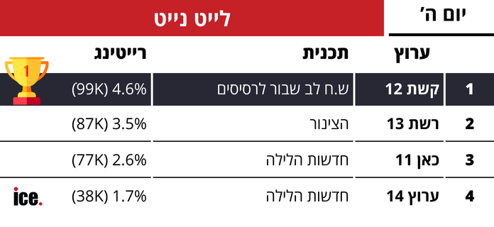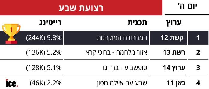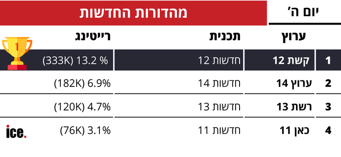 רייטינג: ערוץ 14 ורשת 13 ראש בראש, קשת 12 ממשיכה לשלוט