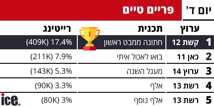 הקרב על הרייטינג בין הערוצים הגדולים בישראל נמשך אתמול (רביעי) במהלך חול המועד פסח, והביא עמו לא מעט הפתעות. התוכנית שרשמה את נתוני הצפייה הגבוהים ביותר בפריים טיים היא כמובן חתונה ממבט ראשון בקשת 12, שהשיגה 17.4% (408 אלף צופים. משחק רבע גמר ליגת האלופות בין ארסנל לריאל מדריד ששודר בערוץ הספורט ובו הספרדים הודחו אחרי השפלת ענק, במקום השני עם 9.2% (252 אלף צופים).