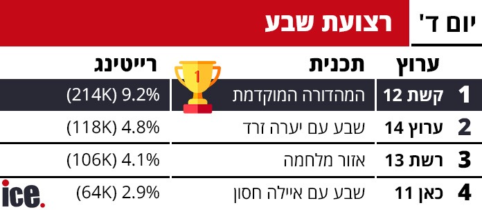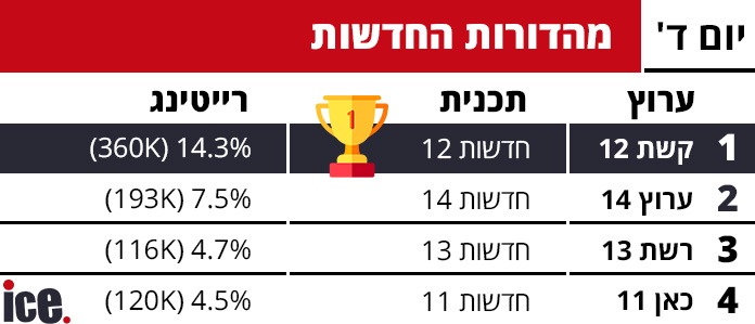 הקרב על הרייטינג בין הערוצים הגדולים בישראל: קשת 12 שולטת ללא עוררין בכל הגזרות, כאן 11 ממשיכים להפתיע, ערוץ הספורט בנתונים מטורפים, ערוץ 14 בירידה ומה עם רשת 13?