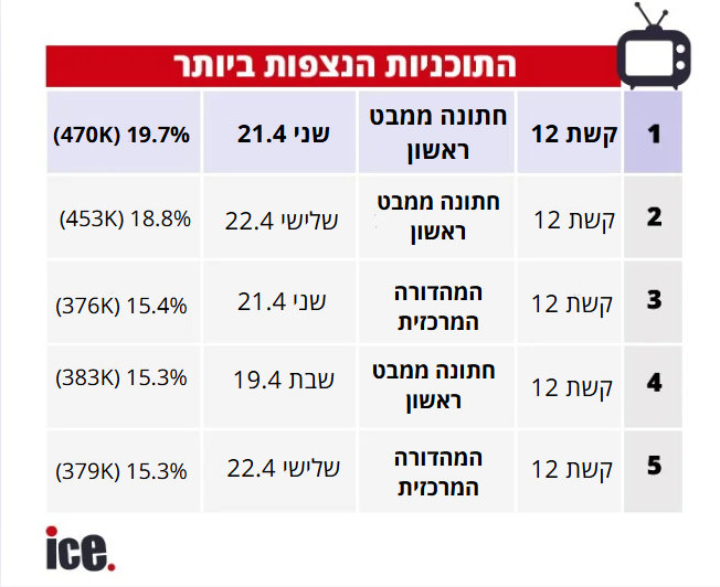 פרקי הסיום של חתונה ממבט ראשון היו רחוקים מכולם, אחריהן היו המהדורות המרכזיות של ערוץ 12. מה היה יום הצפייה החזק ביותר? ומי לקחה את תואר התכנית הנצפית לשבוע?