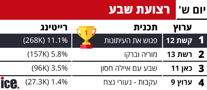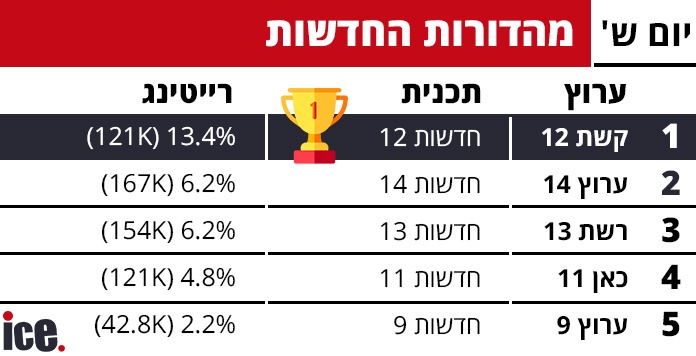 4.הנתונים בטבלת מהדורת החדשות לא מסתדרים.אור 04/2025/27הגב לתגובה זו1 0שימו לב כי מקום ראשון קשת 12 במקום 1 עם 13.4% ו121k צופים. המהדורה של ערוץ 14 עם 6.2% ו**167k צופים**.. איך זה מסתדר?סגור