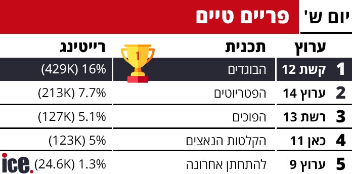 גם אמש (שבת) קשת 12 שלטה בכל רצועות השידור עם התוכניות המובילות בכל קטגוריה. "הבוגדים" היא התוכנית בעלת הרייטינג הגבוה ביותר מבין כל התוכניות שנסקרו, עם 429,000 צופים ומעל 16% לפרק ההשקה. ערוץ 14 מציג נוכחות משמעותית במיוחד במהדורת החדשות ובפריים טיים, בעוד שכאן 11 ורשת 13 מתחרות באופן צמוד במספר קטגוריות.