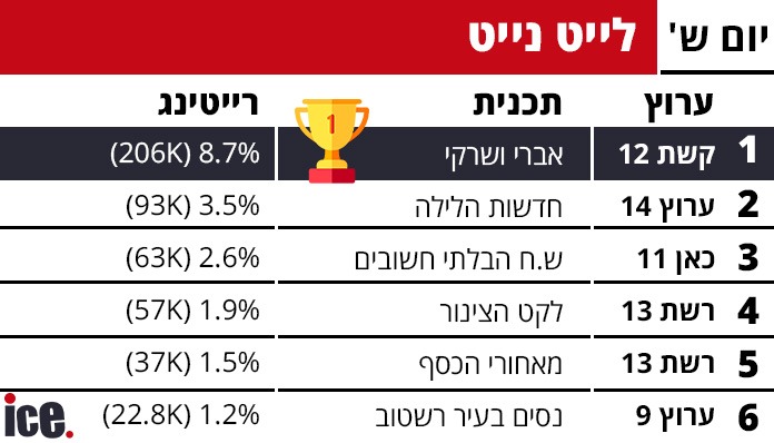 בשידורי הלילה המאוחרים, "אברי ושרקי" בקשת 12 מובילים עם רייטינג מרשים של 8.7%, המתרגם ל-206,000 צופים. במקום השני ניצבת "חדשות הלילה" בערוץ 14 עם 3.5% (93,000 צופים), ואחריה "ש.ח בלתי חשובים" בכאן 11 עם 2.6% (63,000 צופים). המקומות הרביעי והחמישי נתפסו על ידי "לקט הצינור" ברשת 13 עם 1.9% (57,000 צופים) ו"מאחורי הכסף" ברשת 13 עם 1.5% (37,000 צופים). במקום השישי נמצאת התוכנית "נסים בעיר רשטוב" בערוץ 9 עם 1.2% (22,800 צופים).