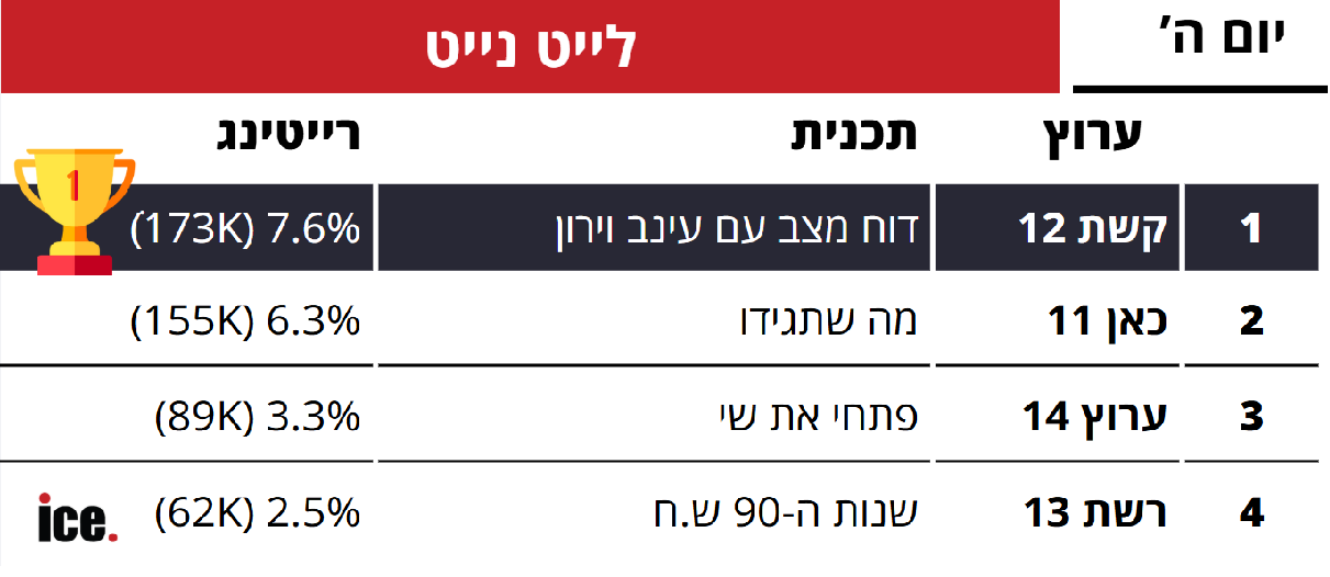 המגמה נמשכה גם לשעות הלילה, כאשר דו"ח מצב של קשת 12 רשמו 7.6% רייטינג ו-173 אלף צופים, כאן 11 שמרו על המקום השני עם ספיישל העצמאות של מה שתגידו שמשך כ155 אלף צופים והיווה כ6.3% רייטינג.