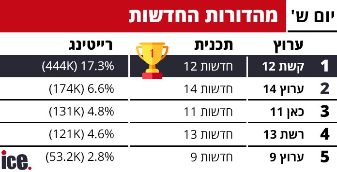 מהדורות החדשות ממשיכות להיות הפורמט המוביל בטלוויזיה הישראלית. "חדשות 12" בקשת 12 מובילה עם רייטינג מרשים של 17.3% ו-444,000 צופים. במקום השני "חדשות 14" בערוץ 14 עם 6.6% רייטינג ו-174,000 צופים, ובמקום השלישי "חדשות 11" בכאן 11 עם 4.8% רייטינג ו-131,000 צופים. "חדשות 13" ברשת 13 במקום הרביעי עם 4.6% רייטינג ו-121,000 צופים, ו"חדשות 9" בערוץ 9 סוגרת את החמישייה עם 2.8% רייטינג ו-53,200 צופים.