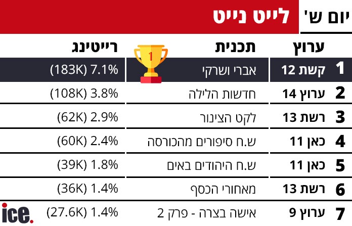 בתכניות הלילה, "אברי ושרקי" בקשת 12 ממשיכים להוביל עם 7.1% רייטינג ו-183,000 צופים. "חדשות הלילה" בערוץ 14 במקום השני עם 3.8% רייטינג ו-108,000 צופים, ואחריה "לקט הצינור" ברשת 13 עם 2.9% רייטינג ו-62,000 צופים. במקום הרביעי "ש.ח סיפורים מהכורסה" בכאן 11 עם 2.4% רייטינג ו-60,000 צופים, ובמקום החמישי "ש.ח היהודים באים" גם בכאן 11 עם 1.8% רייטינג ו-39,000 צופים. "מאחורי הכסף" ברשת 13 במקום השישי עם 1.4% רייטינג ו-36,000 צופים, ו"אישה בצרה - פרק 2" בערוץ 9 סוגרת את הרשימה עם 1.4% רייטינג ו-27,600 צופים.