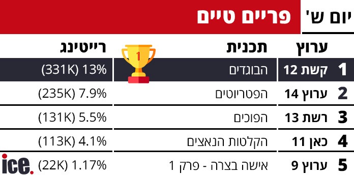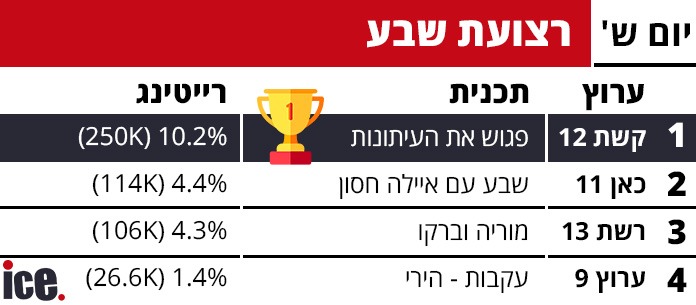 5.ומה לגבי נתוני הרייטינג של יום שישי? (ל"ת)אזרח הגון 05/2025/05הגב לתגובה זו1 0סגור