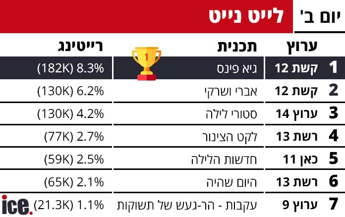 ברצועת הלייט נייט, "גיא פינס" של קשת 12 מוביל עם רייטינג של 8.3% המייצגים 182 אלף צופים. במקום השני "אברי ושרקי" של קשת 12 עם 6.2% ו-130 אלף צופים. במקום השלישי ממוקמת תוכנית "סטורי לילה" של ערוץ 14 עם 4.2% ו-130 אלף צופים. במקום הרביעי נמצאת תוכנית "לקט הציבור" ברשת 13 עם 2.7% ו-77 אלף צופים. את המקום החמישי תופסת "חדשות הלילה" של כאן 11 עם 2.5% ו-59 אלף צופים, ובמקום השישי "היום שהיה" של רשת 13 עם 2.1% ו-65 אלף צופים. את המקום השביעי תופסת תוכנית "עקבות - הרגעים של תשקוזי" בערוץ 9 עם 1.1% ו-21.3 אלף צופים.
