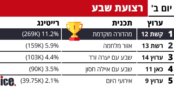 ובמקום השלישי "המרדף" של כאן 11 עם 6.3% ו-175 אלף צופים. במקום הרביעי נמצאת תוכנית "אבודים - בכורה" של רשת 13 עם 5.8% ו-141 אלף צופים. את החמישייה סוגרת תוכנית "עקבות - צלצול משום מקום" של ערוץ 9 עם 1.33% ו-25.3 אלף צופים.