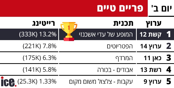 רצועת הפריים טיים מציגה את הרייטינג הגבוה ביותר של היום, כאשר "המופע של עדי אשכנזי" בקשת 12 מוביל עם רייטינג מרשים של 13.2% ו-333 אלף צופים. במקום השני נמצאת תוכנית "הפטריוטים" בערוץ 14 עם 7.8% ו-221 אלף צופים.
