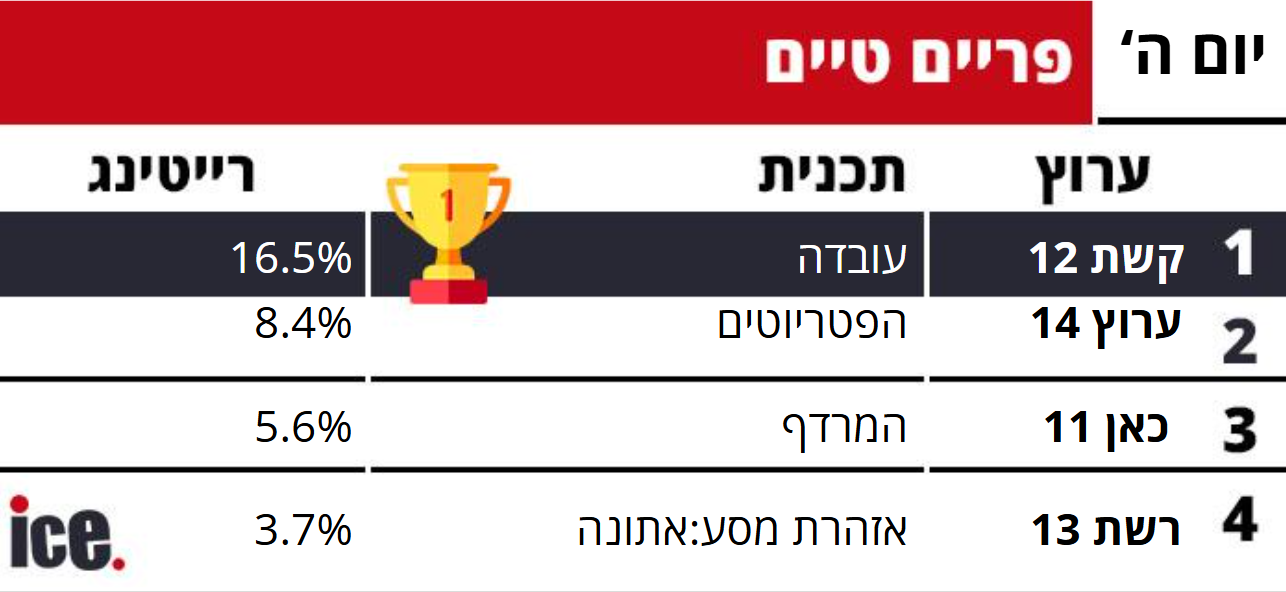 גם בפריים טיים, קשת 12 זכו למרבית הצופים. כידוע, אמש שודר פרק מיוחד של עובדה בו החטוף ששוחרר עומר שם טוב חשף באופן גלוי את חוויותיו מהשבי ואת ההתמודדות שלו מאז ששוחרר. הפרק זכה ל391 אלף צופים ו-16.5% רייטינג. למקום השני הגיעה התוכנית הפטריוטים עם 223 אלף צופים ו-8.4% רייטינג. למקום השלישי הגיע ערוץ כאן 11 עם התוכנית המרדף שזכתה ל163 אלף צופים ו-5.6% רייטינג. את הרשימה נועל ערוץ עם התוכנית אזהרת מסע: אתונה זכתה ל99 אלף צופים ו-2.8% רייטינג.