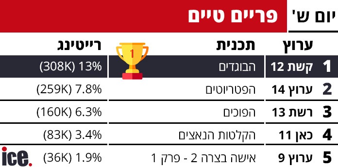 בשעות הפריים טיים הצליחה תכנית הריאליטי "הבוגדים" בקשת 12 למשוך 308 אלף צופים עם 13% רייטינג. "הפטריוטים" בערוץ 14 נמצאת במקום השני עם 259 אלף צופים (7.8%), ואחריה "הפוכים" ברשת 13
