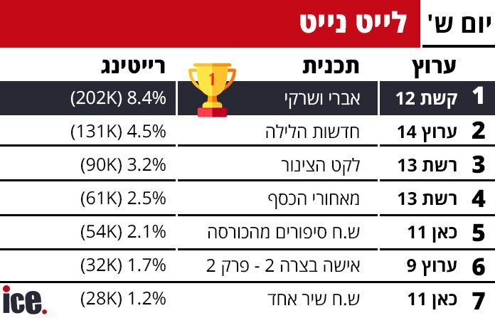 בשעות הלייט נייט, הצמד "אברי ושרקי" שבקשת 12 הוביל עם 202 אלף צופים (8.4%), כשאחריו "חדשות הלילה" בערוץ 14 עם 131 אלף צופים (4.5%). "לקט הצינור" ברשת 13 השיג 90 אלף צופים (3.2%), "מאחורי הכסף" באותו ערוץ משך 61 אלף צופים (2.5%), ו"סיפורים מהכורסה" בכאן 11 עם 54 אלף צופים (2.1%). "אישה בצרה 2 - פרק 2" בערוץ 9 ו"שיר אחד" בכאן 11 סגרו את הרשימה עם 32 אלף (1.7%) ו-28 אלף צופים (1.2%) בהתאמה.