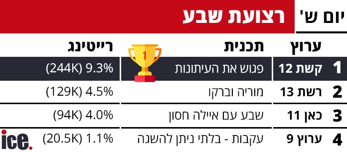 3.ומה לגבי נתוני הרייטינג של יום שישי? (ל"ת)אזרח הגון 05/2025/11הגב לתגובה זו1 0סגור