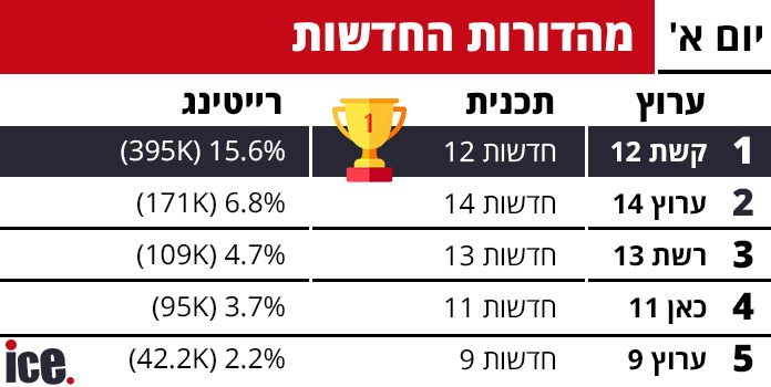 במהדורות החדשות, "חדשות 12" בקשת 12 ממשיכה להוביל בפער עצום עם רייטינג של 15.6% (כ-395 אלף צופים). במקום השני "חדשות 14" בערוץ 14 עם 6.8% (כ-171 אלף צופים), ובמקום השלישי "חדשות 13" ברשת 13 עם 4.7% (כ-109 אלף צופים). "חדשות 11" בכאן 11 הגיע למקום הרביעי עם 3.7% (כ-95 אלף צופים), ו"חדשות 9" בערוץ 9 במקום החמישי עם 2.2% (כ-42.2 אלף צופים).