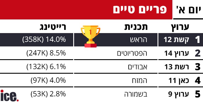 ברצועת הפריים טיים, "הראש" בקשת 12 מככב במקום הראשון עם רייטינג מרשים של 14% המייצג כ-358 אלף צופים לסיום העונה. במקום השני "הפטריוטים" בערוץ 14 עם 8.5% (כ-247 אלף צופים), ובמקום השלישי "אבודים" ברשת 13 עם 6.1% (כ-132 אלף צופים). "המזח" בכאן 11 הגיע למקום הרביעי עם 4% (כ-97 אלף צופים), ותכנית "בשחורה" בערוץ 9 במקום החמישי עם 2.8% (כ-53 אלף צופים).