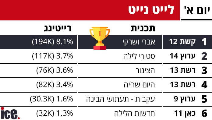 ברצועת הלילה, "אברי ושרקי" בקשת 12 ממשיכה להוביל עם רייטינג מרשים של 8.1% המייצג כ-194 אלף צופים. במקום השני "סטורי לילה" בערוץ 14 עם 3.7% (כ-117 אלף צופים), ובמקום השלישי "הצינור" ברשת 13 עם 3.6% (כ-76 אלף צופים). "היום שהיה" ברשת 13 הגיע למקום הרביעי עם 3.4% (כ-82 אלף צופים), "עקבות - תעתועי הזיכרון" בערוץ 9 במקום החמישי עם 1.6% (כ-30.3 אלף צופים), ו"חדשות הלילה" בכאן 11 במקום השישי עם 1.3% (כ-32 אלף צופים).