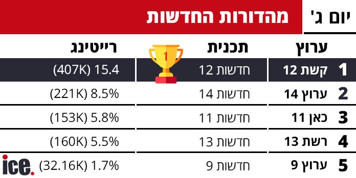 מהדורות החדשות רשמו את הרייטינג הגבוה ביותר מבין כל התוכניות, כאשר "חדשות 12" בקשת 12 השיגה 15.4% (407 אלף צופים), "חדשות 14" בערוץ 14 במקום השני עם 8.5% (221 אלף צופים), "חדשות 11" בכאן 11 במקום השלישי עם 5.8% (153 אלף צופים), "חדשות 13" ברשת 13 במקום הרביעי עם 5.5% (160 אלף צופים), ו"חדשות 9" בערוץ 9 במקום החמישי עם 1.7% (32.16 אלף צופים). נתונים אלה משקפים את המשך המגמה הברורה של עליונות קשת 12 בשוק הטלוויזיה הישראלי, במיוחד בתחום החדשות.