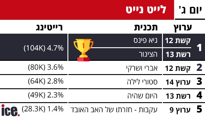 בראש טבלת רייטינג הלייט נייט ניצבת התוכנית "ערב טוב עם גיא פינס" עם 4.7% (104 אלף צופים), מובילה על פני "אברי ושרקי" בקשת 12 שרשמה 3.6% (80 אלף צופים). במקום השלישי "סטורי לילה" בערוץ 14 עם 2.8% (64 אלף צופים), אחריה "היום שהיה" ברשת 13 עם 2.3% (49 אלף צופים), ובמקום החמישי "עקבות - חזרתו של הגנב האבוד" בערוץ 9 עם 1.4% (28.3 אלף צופים).