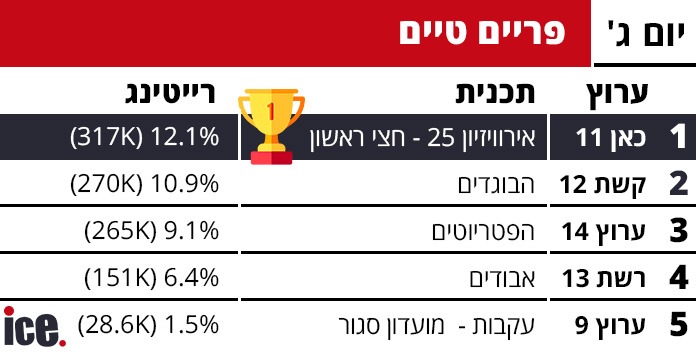 בפריים טיים, כאמור ההובלה הייתה שייכת לכאן 11 עם "אירוויזיון 25 - חצי ראשון" שמשך 12.1% (317 אלף צופים). במקום השני "הבוגדים" בקשת 12 עם 10.9% (270 אלף צופים), ובמקום השלישי "הפטריוטים" בערוץ 14 עם 9.1% (265 אלף צופים). במקום הרביעי "אבודים" ברשת 13 עם 6.4% (151 אלף צופים), ובמקום החמישי "עקבות - מועדון סגור" בערוץ 9 עם 1.5% (28.6 אלף צופים).