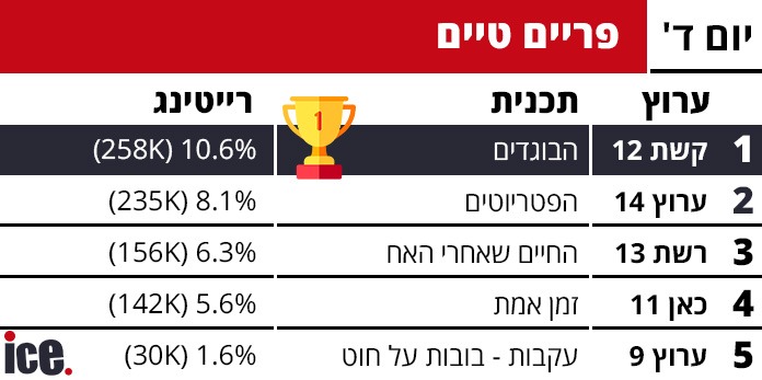 בפריים טיים, "הבוגדים" של קשת 12 מובילים עם 10.6% רייטינג ו-258 אלף צופים, ואחריהם "הפטריוטים" בערוץ 14 עם 8.1% (235 אלף צופים). במקום השלישי נמצאת התוכנית "החיים שאחרי האח" ברשת 13 עם 6.3% (156 אלף צופים), ואחריה "זמן אמת" בכאן 11 עם 5.6% (142 אלף צופים). "עקבות - בובות על חוט" בערוץ 9 סוגרת את החמישייה הפותחת עם 1.6% (30 אלף צופים).