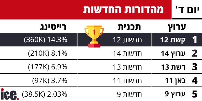 רצועת מהדורות החדשות המרכזיות מציגה את הפערים הגדולים ביותר, כאשר "חדשות 12" מגיעה ל-14.3% רייטינג עם 360 אלף צופים - כמעט כפול מהמתחרה הקרובה. "חדשות 14" במקום השני עם 8.1% (210 אלף צופים), "חדשות 13" במקום השלישי עם 6.9% (177 אלף צופים), "חדשות 11" במקום הרביעי עם 3.7% (97 אלף צופים), ו"חדשות 9" במקום החמישי עם 2.03% (38.5 אלף צופים).