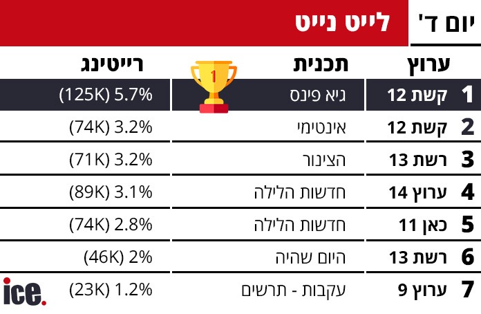 אחרי גולן שגלש במעט לרצועה המאוחרת עם הדיווחים והשיג 5.7% ו-161 אלף צופים, ברצועת הלייט נייט, "גיא פינס" המשיך עם 5.7% רייטינג המשקפים 125 אלף צופים. אחריו מדורגות "אינטימי" בקשת 12 עם 3.2% (74 אלף צופים) ו"הצינור" ברשת 13 עם 3.2% אף הוא (71 אלף צופים).