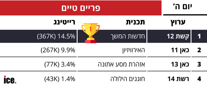 ברצועת הפריים טיים, מובילים גם כאן קשת 12 עם המשך למהדורת החדשות שהגיעה ל-14.5% רייטינג ו-367 אלף צופים. במקום השני ערוץ 11, ששידרו סרט תיעודי על עדן גולן והמשלחת הישראלית והביאו ל-9.9% ו-267 אלף צופים. במקום השלישי ערוץ 13 עם התוכנית "אזהרת מסע אתונה" שהביאה ל-3.4% רייטינג ו-77 אלף צופים. גם ברצועת הפריים טיים ערוץ 14 סוגרת את הרשימה עם החגיגות מההילולה שהביא ל-1.4% ו-43 אלף צופים.
