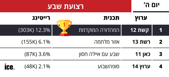 המשדר המיוחד של חצי גמר האירוויזיון הביא לשיא בצפיות, אך למרות זאת ערוץ 12 ממשיך להוביל ברוב שעות השידור