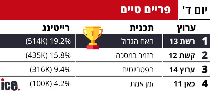 ברצועת הפריים טיים, הובילה תכנית "האח הגדול" ברשת 13 עם רייטינג מרשים של 19.2% (514 אלף צופים), תוך שהיא זוכה לציון המקום הראשון. במקום השני נמצאת תכנית "הזמר במסכה" בקשת 12 עם 15.8% (435 אלף צופים) בלבד.