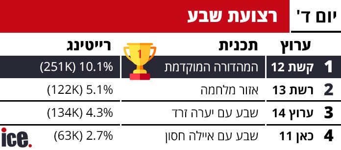 ברצועת השעה שבע, הובילה תכנית "המחזור המוקדמת" בקשת 12 עם רייטינג גבוה של 10.1% (251 אלף צופים), תוך שהיא זוכה לציון המקום הראשון. במקום השני נמצאת תכנית "אזור מלחמה" ברשת 13 עם 5.1% (122 אלף צופים), ואחריה "שבע עם יערה זרד" בערוץ 14 עם 4.3% (134 אלף צופים). בתחתית הטבלה מופיעה תכנית "שבע עם איילה חסון" בכאן 11 עם 2.7% (63 אלף צופים).