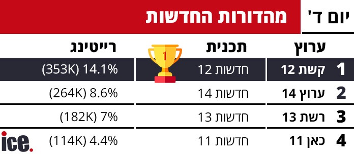 במהדורות החדשות, הובילה "מהדורת 12" בקשת 12 עם רייטינג של 14.1% (353 אלף צופים), תוך שהיא זוכה לציון המקום הראשון. במקום השני נמצאת "מהדורת 14" בערוץ 14 עם 8.6% (264 אלף צופים), ואחריה "מהדורת 13" ברשת 13 עם 7% (182 אלף צופים). בתחתית הטבלה מופיעה "מהדורת 11" בכאן 11 עם 4.4% (114 אלף צופים).