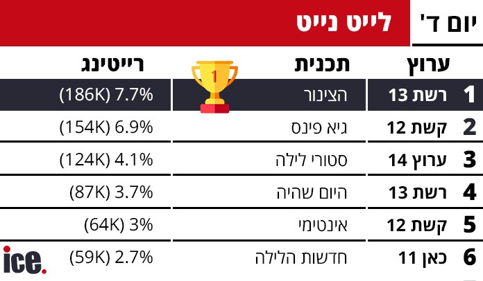 ברצועת הלייט נייט, הובילה תכנית "הצינור" ברשת 13 עם רייטינג מרשים של 7.7% (186 אלף צופים), תוך שהיא זוכה לציון המקום הראשון ברצועה. במקום השני נמצאת תכנית "גיא פינס" בקשת 12 עם 6.9% (154 אלף צופים), ואחריה "סטורי לילה" בערוץ 14 עם רייטינג של 4.1% (124 אלף צופים). במקום הרביעי מופיעה תכנית "היום שהיה" ברשת 13 עם 3.7% (87 אלף צופים), ואחריה "אינטימי" בקשת 12 עם 3% (64 אלף צופים). בתחתית הטבלה נמצאת תכנית "חדשות הלילה" בכאן 11 עם 2.7% (59 אלף צופים).